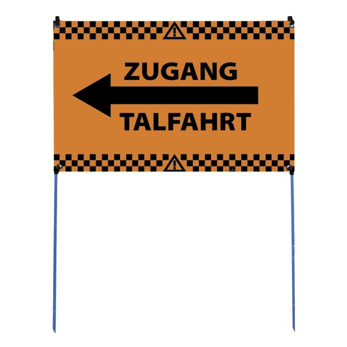 Hinweis- und Gefahrentransparent VERKEHRSORANGE "ZUGANG TALFAHRT" LINKS mit 2 Stangen