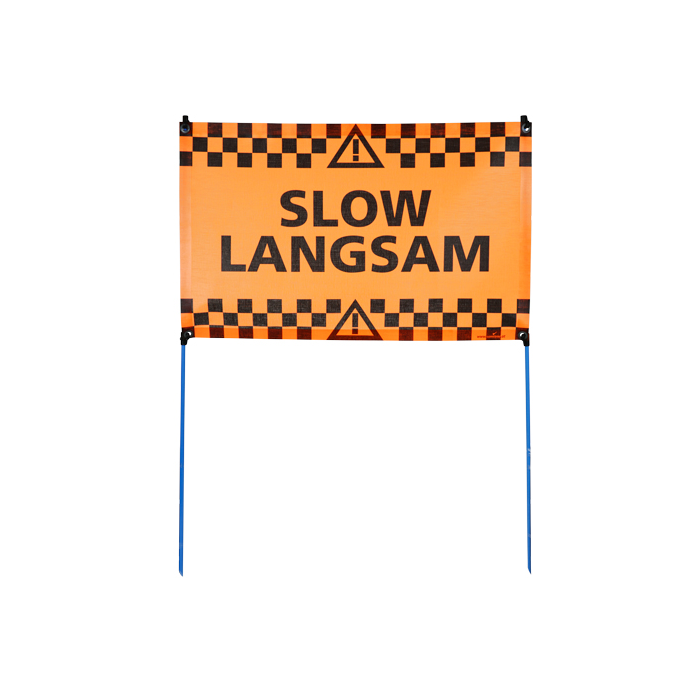 Hinweis- und Gefahrentransparent VERKEHRSORANGE "LANGSAM - SLOW" klein, mit 2 Stangen