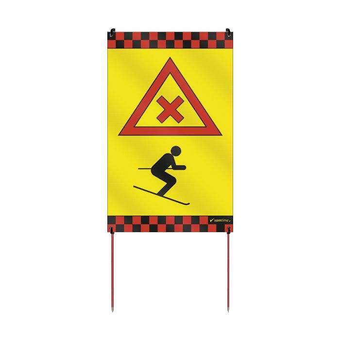 Hinweis- und Gefahrentransparent Rot/Gelb "KREUZUNG SKIFAHRER" mit 2 Stangen